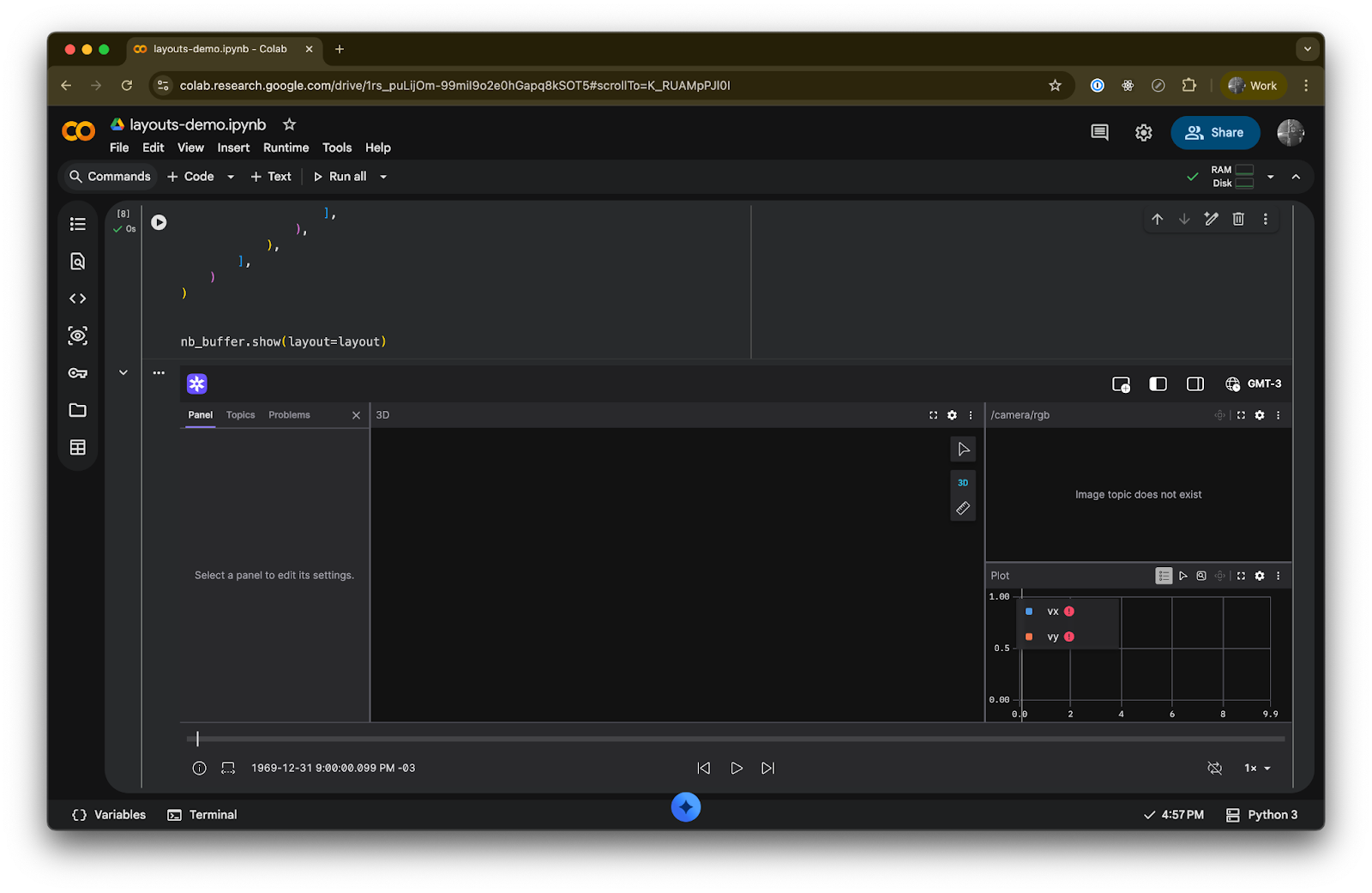 The foxglove.layouts module provides a collection of Python dataclasses for constructing layouts. Import the classes you need, compose them into a Layout, and pass it to nb_buffer.show().