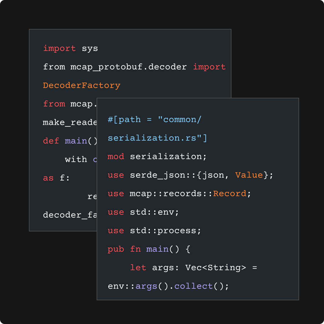 Because MCAP embeds message schemas alongside your data, your files remain self-describing and future-proof, ensuring you can always decode and analyze them even as your code evolves.