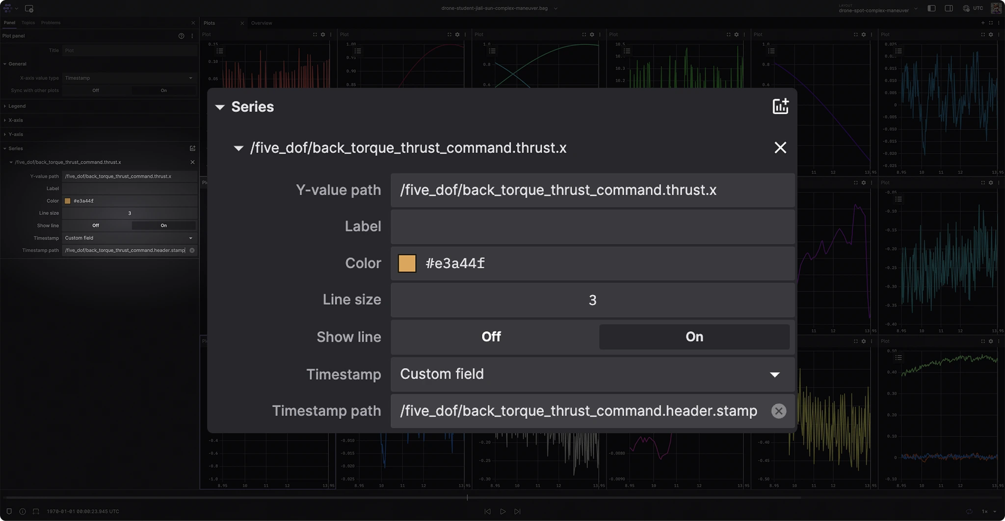 Foxglove now lets you choose an arbitrary timestamp field from your messages when plotting data, giving you more control over how time-based data is visualized. While standard log time is still required for indexing and playback—such as receive time in ROS or timestamp in ULog—the Plot and State Transitions panels support MCAP publish time, ROS header stamps, and custom fields from any part of a message. This flexibility helps eliminate time skew, improves clarity, and allows you to visualize data in a way that best reflects the real-world events your robots experienced.