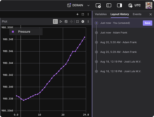 Foxglove now helps you stay in control with the new Layout History in the sidebar. Users on Free and Starter plans can see who last saved a layout, while Team plans and above unlock full version history with the ability to preview and restore past versions. Every explicitly saved layout is tracked, so you can see what changed, who changed it, and when, giving you the ability to restore a previous version with a single click—so you never lose a working layout again.