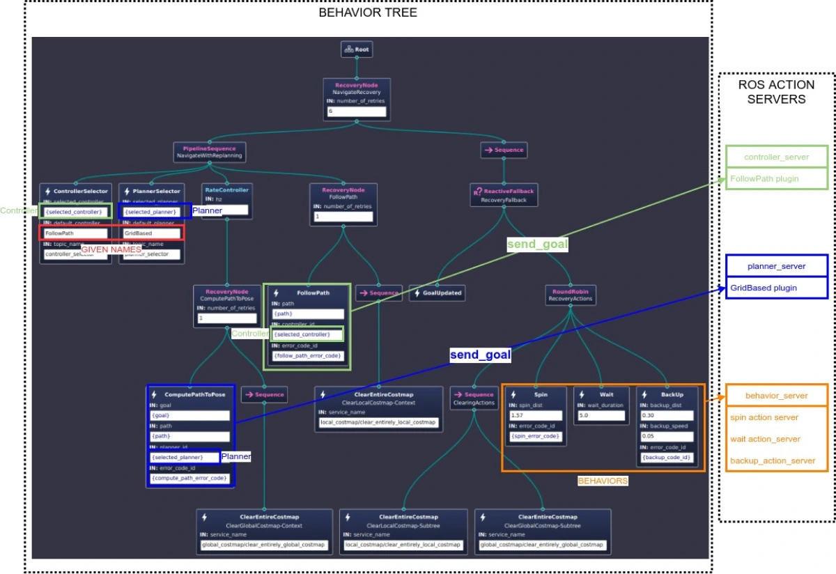 Lastly, the most important parameters for the bt_navigator are the navigators used (which are also plugins) and the behavior trees associated with each navigator. The default parameter names are default_nav_through_poses_bt_xml and default_nav_to_pose_bt_xml for the default navigators. By selecting different behavior trees—encoded in XML files—you can modify the robot’s behavior. To edit and visualize behavior trees, use the tool Groot2.