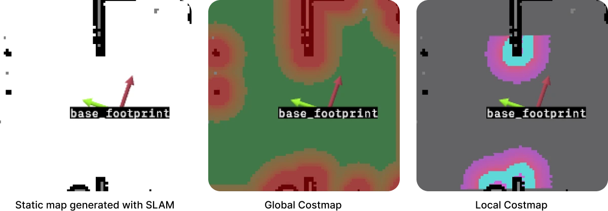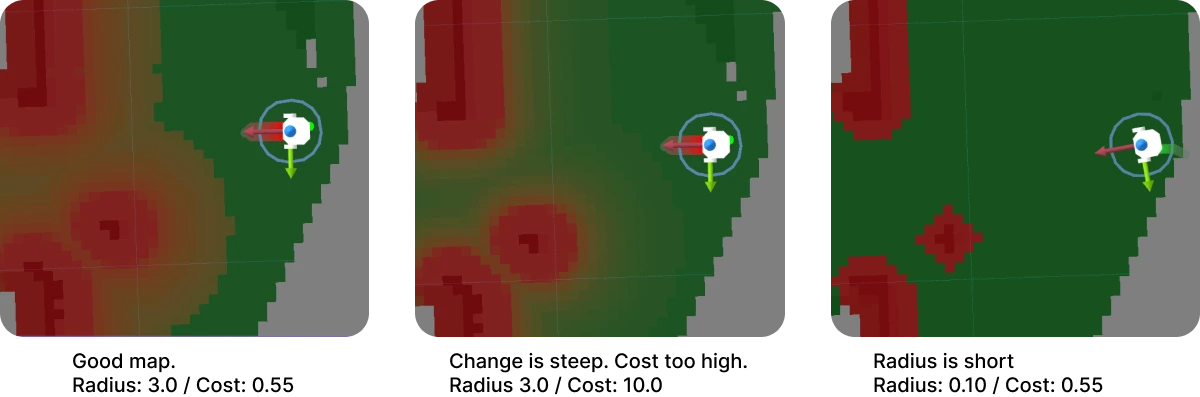 • The cost_scaling_factor defines how the robot behaves near obstacles—whether it avoids entering the radius entirely or simply navigates more slowly.