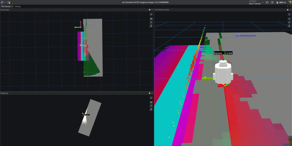 Starting with maps, we can see three different ones. The first map was created using SLAM with slam_toolbox. The second is the global costmap, configured in Foxglove to show “free” areas in green and occupied areas in red, making it easier to understand where the planner can trace routes. Lastly, the third map displays the local costmap, using a colormap commonly used in robotics.