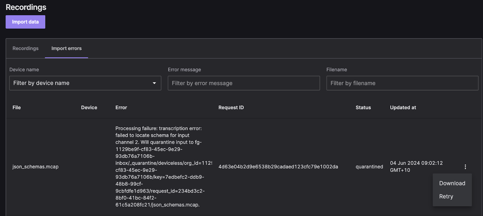 - Download: This option allows you to download the input file that failed to import. You can inspect the file for errors using the MCAP CLI by running the mcap doctor command. In some cases, MCAP files can be automatically repaired using the mcap recover subcommand.