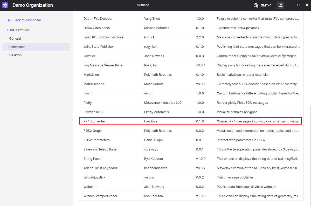 The PX4 Converter Extension is available in the Foxglove extension registry. You can install it by opening Settings → Extensions and selecting the PX4 Converter. Once installed, Foxglove will automatically convert the relevant messages whenever you load a panel that uses them.