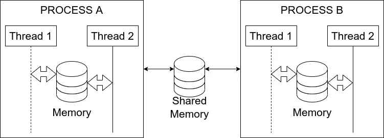 Threads within the same process have a significant advantage when it comes to data access, as they share the same memory registers. This allows for faster communication and data handling within the process. Conversely, processes must rely on shared-memory registers or other inter-process communication mechanisms to exchange information. For example, Process ‘A’ may write data to shared memory and notify Process ‘B’ when the data is ready. While this shared-memory exchange is slower than accessing registers, it remains an efficient means of communication.