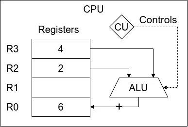 A diagram of a CPU, ALU, CU and registers.