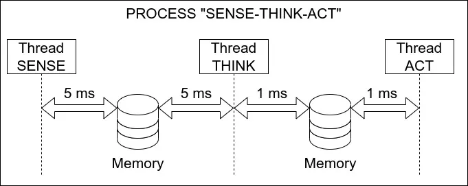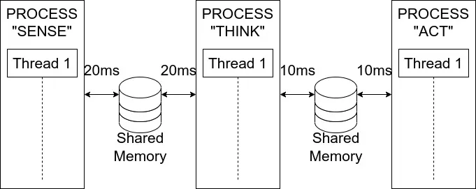 Consider the typical robotic workflow: sense, think, and act. If each step operates in a separate process, every time new data is generated, communication between processes introduces a small but cumulative delay to the overall processing time. However, by implementing multi-threaded processes where some or all steps share the same memory space, data transmission becomes significantly faster. Threads within the same process can access shared memory directly, eliminating the need for slower shared-memory exchanges between processes.