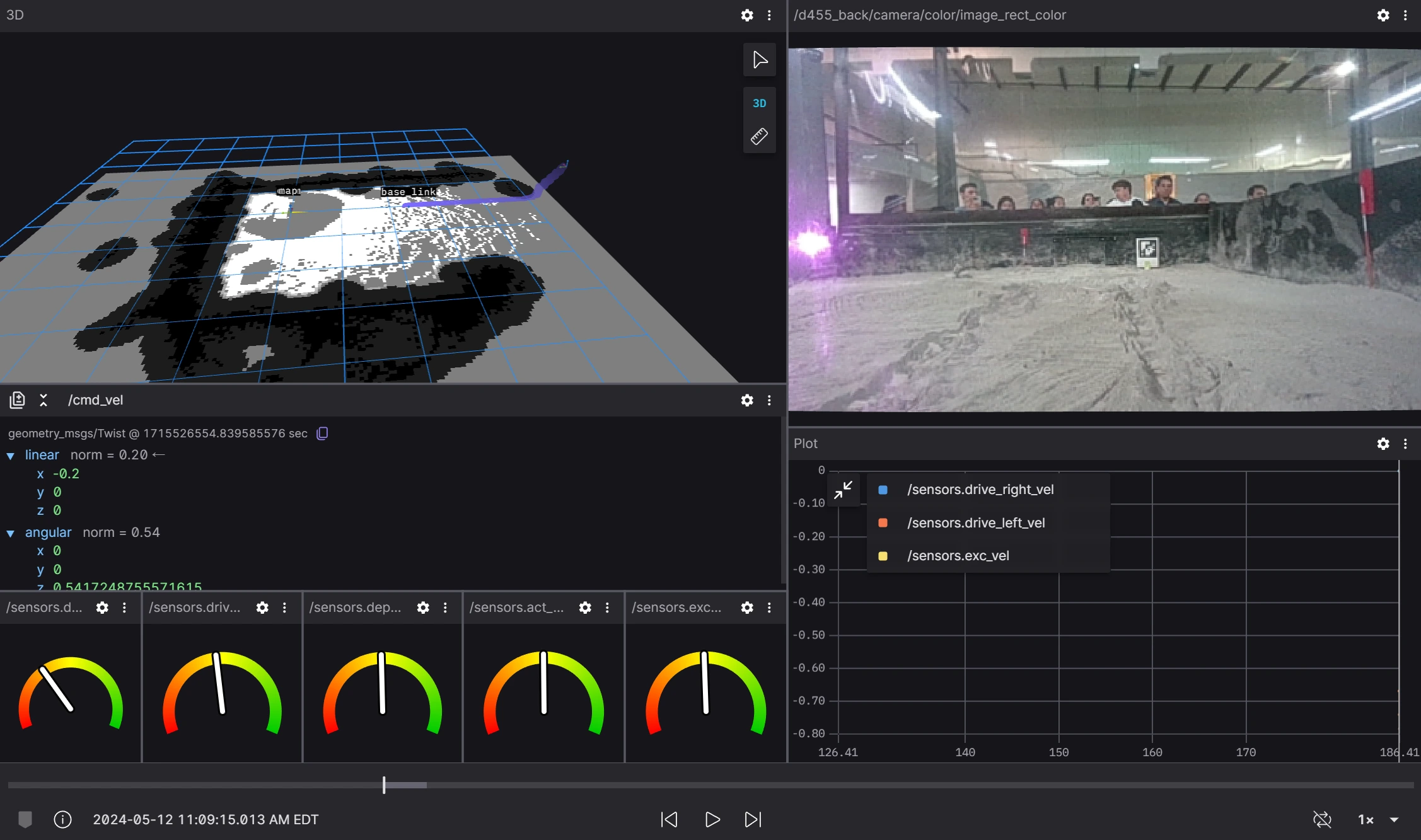 The integration of Foxglove has significantly enhanced the team’s ability to diagnose issues in real time, improving both robot performance and operational efficiency. The Foxglove interface allows the team to detect changes quickly and take corrective action before any lasting damage occurs. By displaying all the robot’s messages in real time, the team can easily identify problem areas. Our default setup includes a camera view (to gather situational awareness of the robot), a graph with the speeds of all of our motors (to make sure the robot is moving like it’s supposed to), a set of gauges showing the current through every motor (to make sure that no motors are stalled), a text block of our autonomous commanded velocity (to make sure the autonomy system doesn’t ask the robot to do something stupid), and a 3-D map of the robot’s surroundings with the path the robot is planning to take shown on top (to make sure the robot can actually see all the obstacles and isn’t trying to drive over them). We also have specific setups for different purposes, such as debugging sensors, increased situational awareness, and reviewing data after a test or competition run is complete.