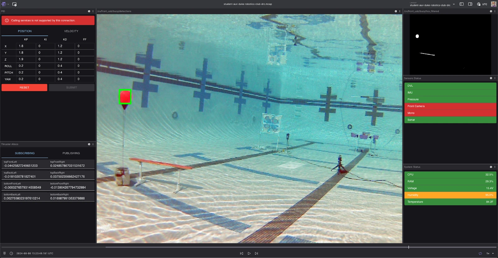 During pool tests, the Duke Robotics team relies on real-time data to monitor Oogway’s performance. This includes tracking the robot’s position, sensor readings, and thruster status, as well as visualizing detections from the CV subsystem. To facilitate this, the team uses Foxglove, a robust data visualization tool, to monitor the robot’s systems and performance.