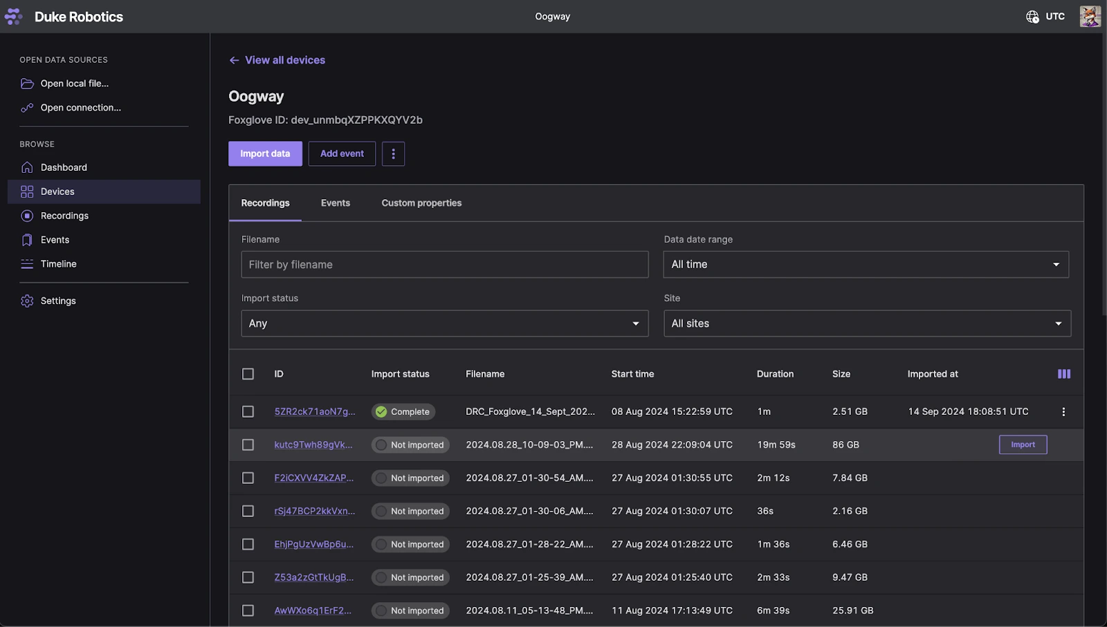 The Foxglove devices UI showing data automatically ready for import via the Foxglove Agent.