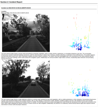 The automated reporting system has transformed the way they handle data. Each time the team completes a road trial, they simply run a Python script that pulls relevant data from the MCAP files. This data is then fed into a generative AI model, which compiles the information into a structured report. This AI-driven approach allows the team to generate both regular and incident reports swiftly and accurately, reducing the workload on the team and ensuring they meet regulatory requirements without delays.