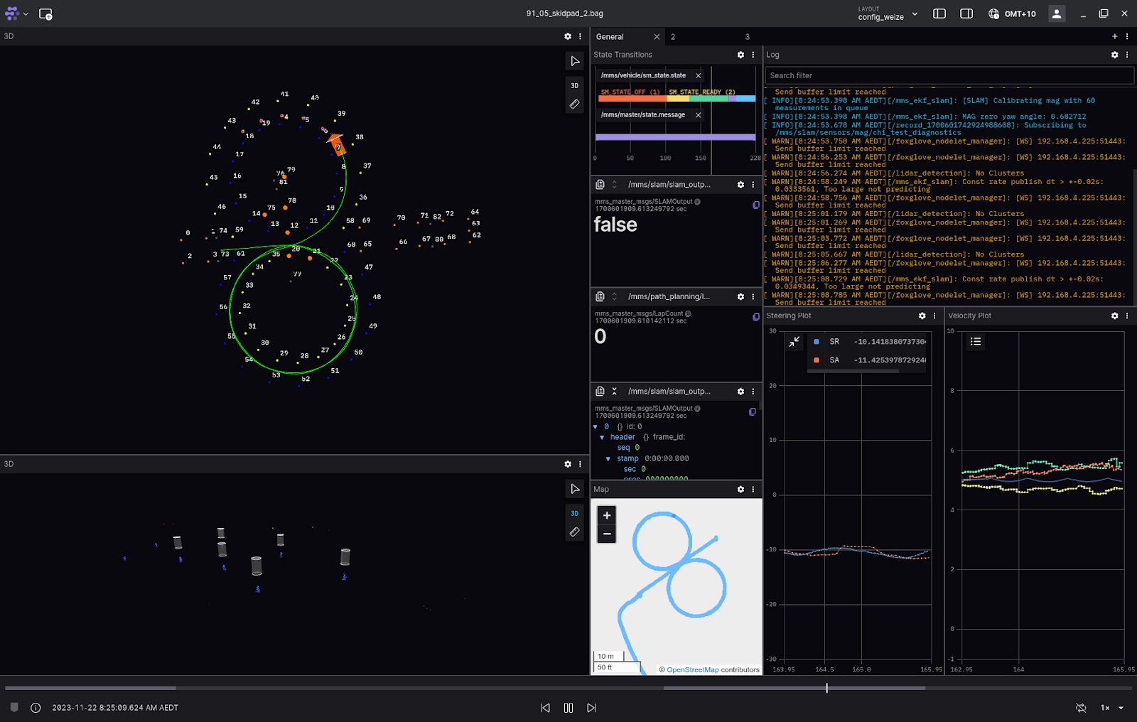 Foxglove enables advanced 3D data visualization, showcasing critical elements such as Monash Motorsport’s lidar point cloud and car position, while simultaneously overlaying information about path planning and motion control in a unified view. These tools significantly enhance the debugging process by making it more intuitive and efficient, allowing engineers to identify issues faster. Additionally, Foxglove simplifies post-analysis, streamlining the evaluation of testing data and enabling teams to make informed improvements with greater ease.