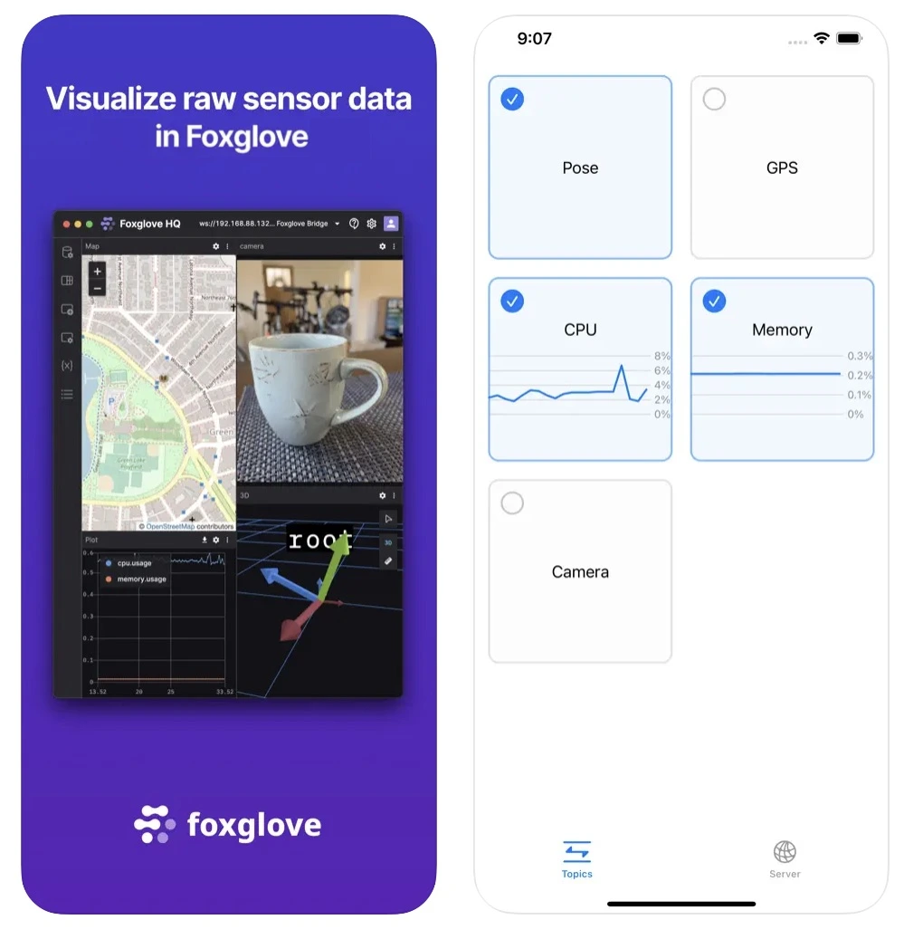 Much like a typical robot, our smartphones are packed with sensors – like an accelerometer, gyroscope, GPS, and camera. With our iOS app, you can now instantly use a WebSocket connection to stream and visualize multimodal sensor data in Foxglove.
