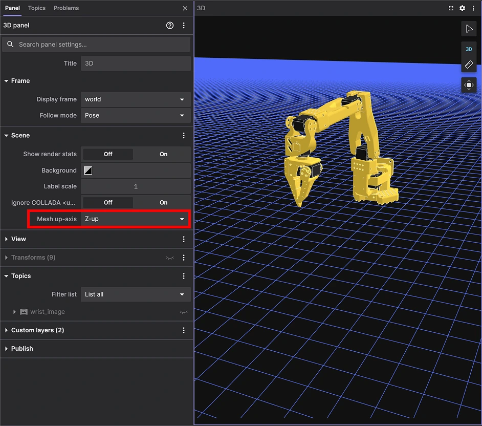 Let’s start by visualizing the urdf of our robot. First, launch Foxglove and open a connection to websocket url ws://localhost:8765. If there is no 3D panel in your default layout, add it, then go to Settings>Scene and make sure Mesh up-axis is set to Z-up. Note: if it’s not set to Z-up select it and restart Foxglove: