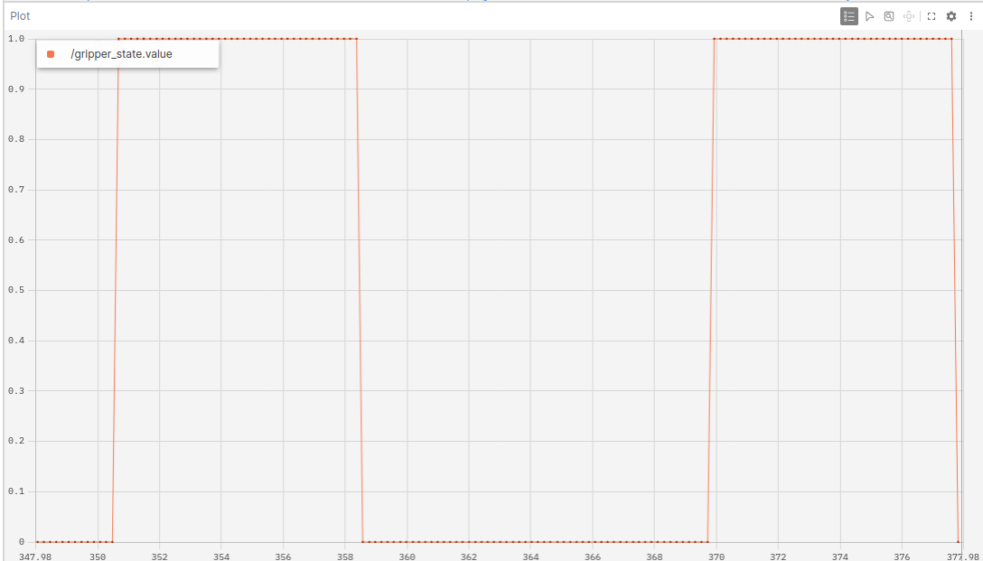 Adding a plot panel to Foxglove, we can now drag and drop the gripper_state value from the Topics tab to the plot panel, and we will be able to display the state as follows: