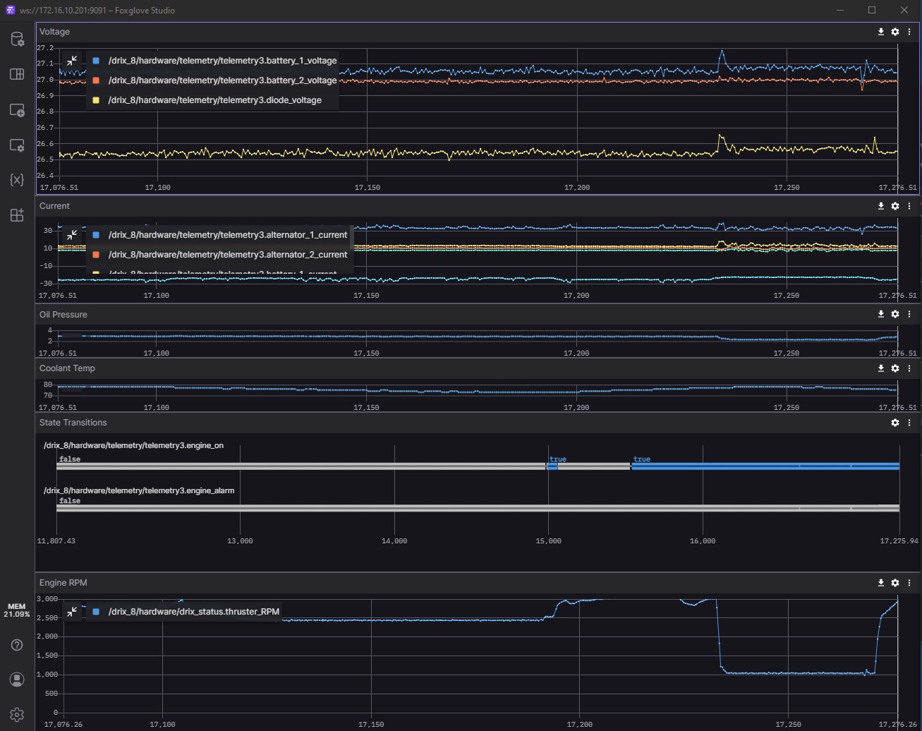 When launching their ASVs from ships at sea for missions, researchers use Foxglove to teleoperate the vessels from laptops onboard the host ship. They can also display real-time feeds of multimodal data – from camera images and GPS points to plotted kinematics and filtered logs – and monitor operational parameters critical to mission success – like the engine RPM, or the temperature of the cooling system and exhaust. All these visualizations work together to give researchers a well-rounded understanding of what’s going on.