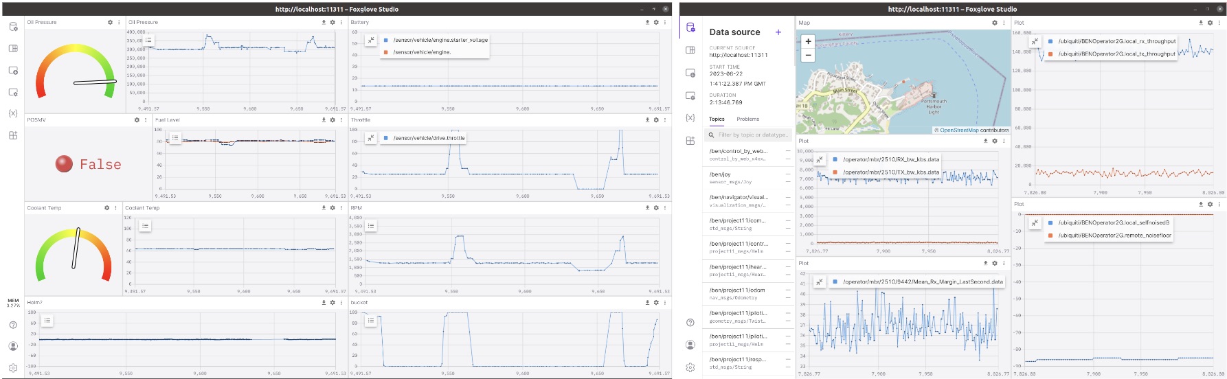 Foxglove layouts are used to monitor engine parameters (like RPM, coolant temperature, and fuel level) and vessel trajectory.